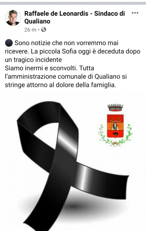 "Sono notizie che non vorremmo mai ricevere. La piccola Sofia oggi è deceduta dopo un tragico incidente...Siamo inermi e sconvolti. Tutta l’amministrazione comunale di Qualiano si stringe attorno al dolore della famiglia."