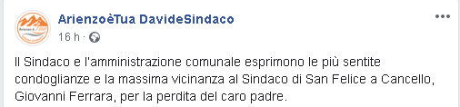 "Il Sindaco e l’amministrazione comunale esprimono le più sentite condoglianze e la massima vicinanza al Sindaco di San Felice a Cancello, Giovanni Ferrara, per la perdita del caro padre."