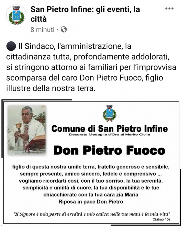 "Il Sindaco, l'amministrazione, la cittadinanza tutta, profondamente addolorati, si stringono attorno ai familiari per l’improvvisa scomparsa del caro Don Pietro Fuoco, figlio illustre della nostra terra."