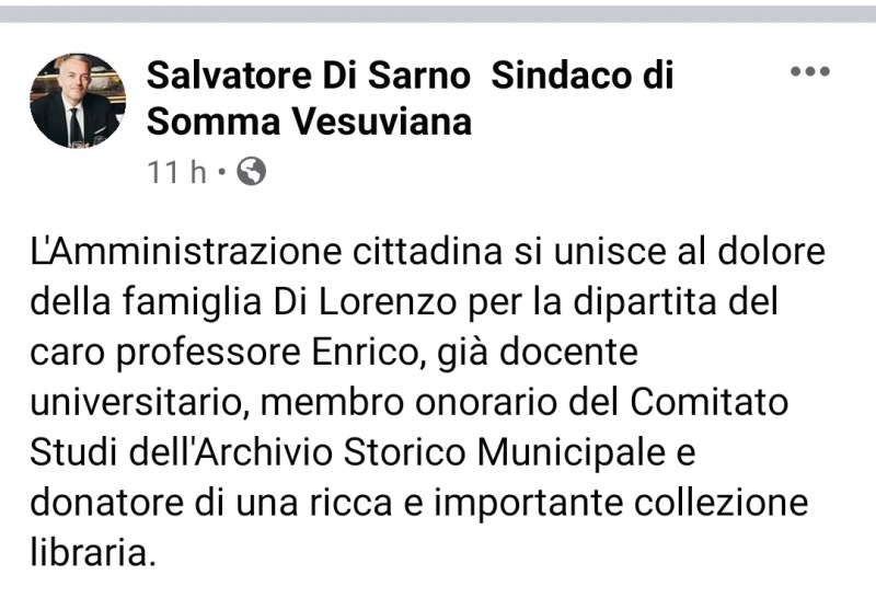 "L'Amministrazione cittadina si unisce al dolore della famiglia Di Lorenzo per la dipartita del caro professore Enrico, già docente universitario, membro onorario del Comitato Studi dell'Archivio Storico Municipale e donatore di una ricca e importante collezione libraria."