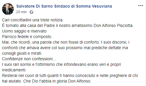 Lo apprendiamo dalla pagina Facebook del Sindaco di Somma Vesuviana, Salvatore Di Sarno: