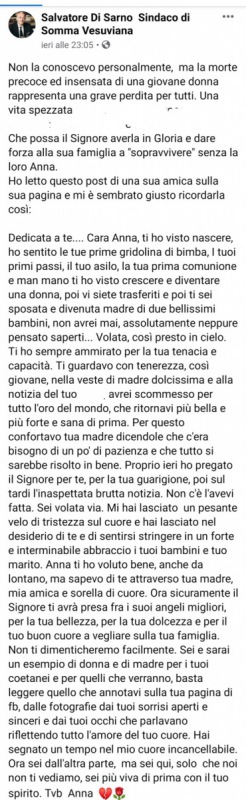 "Non la conoscevo personalmente, ma la morte precoce ed insensata di una giovane donna rappresenta una grave perdita per tutti. Una vita spezzata...Che possa il Signore averla in Gloria e dare forza alla sua famiglia a "sopravvivere" senza la loro Anna. Ho letto questo post di una sua amica sulla sua pagina e mi è sembrato giusto ricordarla così: Dedicata a te.... Cara Anna, ti ho visto nascere, ho sentito le tue prime gridolina di bimba, I tuoi primi passi, il tuo asilo, la tua prima comunione e man mano ti ho visto crescere e diventare una donna, poi vi siete trasferiti e poi ti sei sposata e divenuta madre di due bellissimi bambini, non avrei mai, assolutamente neppure pensato saperti... Volata, così presto in cielo. Ti ho sempre ammirato per la tua tenacia e capacità. Ti guardavo con tenerezza, così giovane, nella veste di madre dolcissima e alla notizia del tuo ..., avrei scommesso per tutto l'oro del mondo, che ritornavi più bella e più forte e sana di prima. Per questo confortavo tua madre dicendole che c'era bisogno di un po' di pazienza e che tutto si sarebbe risolto in bene. Proprio ieri ho pregato il Signore per te, per la tua guarigione, poi sul tardi l'inaspettata brutta notizia. Non c'è l'avevi fatta. Sei volata via. Mi hai lasciato un pesante velo di tristezza sul cuore e hai lasciato nel desiderio di te e di sentirsi stringere in un forte e interminabile abbraccio i tuoi bambini e tuo marito. Anna ti ho voluto bene, anche da lontano, ma sapevo di te attraverso tua madre, mia amica e sorella di cuore. Ora sicuramente il Signore ti avrà presa fra i suoi angeli migliori, per la tua bellezza, per la tua dolcezza e per il tuo buon cuore a vegliare sulla tua famiglia. Non ti dimenticheremo facilmente. Sei e sarai un esempio di donna e di madre per i tuoi coetanei e per quelli che verranno, basta leggere quello che annotavi sulla tua pagina di fb, dalle fotografie dai tuoi sorrisi aperti e sinceri e dai tuoi occhi che parlavano riflettendo tutto l'amore del tuo cuore. Hai segnato un tempo nel mio cuore incancellabile. Ora sei dall'altra parte, ma sei qui, solo che noi non ti vediamo, sei più viva di prima con il tuo spirito. Tvb Anna".