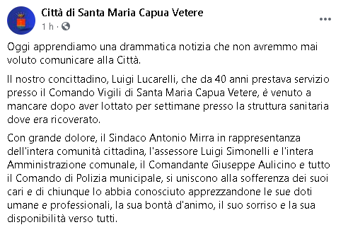 "Oggi apprendiamo una drammatica notizia che non avremmo mai voluto comunicare alla Città. Il nostro concittadino, Luigi Lucarelli, che da 40 anni prestava servizio presso il Comando Vigili di Santa Maria Capua Vetere, è venuto a mancare dopo aver lottato per settimane presso la struttura sanitaria dove era ricoverato. Con grande dolore, il Sindaco Antonio Mirra in rappresentanza dell'intera comunità cittadina, l'assessore Luigi Simonelli e l'intera Amministrazione comunale, il Comandante Giuseppe Aulicino e tutto il Comando di Polizia municipale, si uniscono alla sofferenza dei suoi cari e di chiunque lo abbia conosciuto apprezzandone le sue doti umane e professionali, la sua bontà d'animo, il suo sorriso e la sua disponibilità verso tutti."
