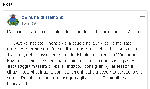 "L’amministrazione comunale saluta con dolore la cara maestra Vanda... Aveva lasciato il mondo della scuola nel 2017 per la meritata quiescenza dopo ben 40 anni di insegnamento, di cui buona parte a Tramonti, nelle classi elementari dell’Istituto comprensivo “Giovanni Pascoli”. Di lei conservano un ottimo ricordo gli alunni, per i quali è stata saggia maestra di vita. Il sindaco, i consiglieri, gli assessori e i cittadini tutti si stringono con i sentimenti del più accorato cordoglio alla sorella Rosalinda, che pure insegna agli alunni di Tramonti, e alla famiglia intera."