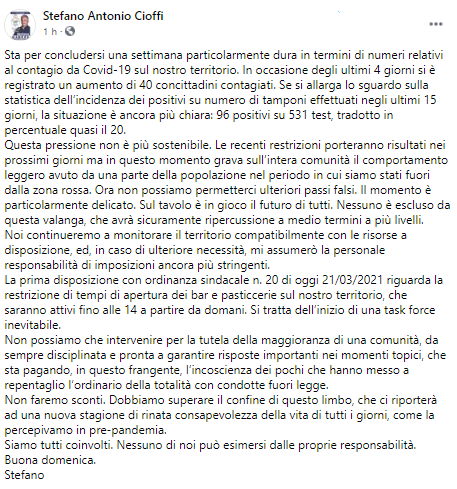 Questo il post pubblicato dal Sindaco di Macerata Campania Stefano Antonio Cioffi: "Sta per concludersi una settimana particolarmente dura in termini di numeri relativi al contagio da Covid-19 sul nostro territorio. In occasione degli ultimi 4 giorni si è registrato un aumento di 40 concittadini contagiati. Se si allarga lo sguardo sulla statistica dell’incidenza dei positivi - continua il Sindaco - su numero di tamponi effettuati negli ultimi 15 giorni, la situazione è ancora più chiara: 96 positivi su 531 test, tradotto in percentuale quasi il 20. Questa pressione non è più sostenibile. Le recenti restrizioni porteranno risultati nei prossimi giorni ma in questo momento grava sull’intera comunità il comportamento leggero avuto da una parte della popolazione nel periodo in cui siamo stati fuori dalla zona rossa. Ora non possiamo permetterci ulteriori passi falsi. Il momento - prosegue il Sindaco - è particolarmente delicato. Sul tavolo è in gioco il futuro di tutti. Nessuno è escluso da questa valanga, che avrà sicuramente ripercussione a medio termini a più livelli. Noi continueremo a monitorare il territorio compatibilmente con le risorse a disposizione, ed, in caso di ulteriore necessità, mi assumerò la personale responsabilità di imposizioni ancora più stringenti. La prima disposizione - prosegue il post - con ordinanza sindacale n. 20 di oggi 21/03/2021 riguarda la restrizione di tempi di apertura dei bar e pasticcerie sul nostro territorio, che saranno attivi fino alle 14 a partire da domani. Si tratta dell’inizio di una task force inevitabile. Non possiamo che intervenire per la tutela della maggioranza di una comunità, da sempre disciplinata e pronta a garantire - continua il Sindaco - risposte importanti nei momenti topici, che sta pagando, in questo frangente, l’incoscienza dei pochi che hanno messo a repentaglio l’ordinario della totalità con condotte fuori legge. Non faremo sconti. Dobbiamo superare il confine di questo limbo, che ci riporterà ad una nuova stagione di rinata consapevolezza della vita di tutti i giorni, come la percepivamo in pre-pandemia. Siamo tutti coinvolti. Nessuno - conclude il post - di noi può esimersi dalle proprie responsabilità. Buona domenica. Stefano".