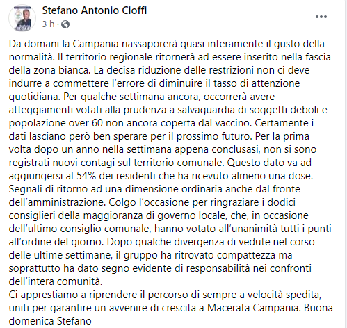 Questo il post publicato sulla sua pagina Facebook dal Sindaco di Macerata Campania Stefano Antonio Cioffi: "Da domani la Campania riassaporerà quasi interamente il gusto della normalità. Il territorio regionale ritornerà ad essere inserito nella fascia della zona bianca. La decisa riduzione delle restrizioni non ci deve indurre a commettere l’errore di diminuire - si legge nel post - il tasso di attenzione quotidiana. Per qualche settimana ancora, occorrerà avere atteggiamenti votati alla prudenza a salvaguardia di soggetti deboli e popolazione over 60 non ancora coperta dal vaccino. Certamente i dati lasciano però ben sperare per il prossimo futuro. Per la prima volta dopo un anno nella settimana appena conclusasi, non si sono registrati nuovi contagi sul territorio comunale. Questo dato - prosegue il post - va ad aggiungersi al 54% dei residenti che ha ricevuto almeno una dose. Segnali di ritorno ad una dimensione ordinaria anche dal fronte dell’amministrazione. Colgo l’occasione per ringraziare i dodici consiglieri della maggioranza di governo locale, che, in occasione dell’ultimo consiglio comunale, hanno votato all’unanimità - prosegue il Sindaco - tutti i punti all’ordine del giorno. Dopo qualche divergenza di vedute nel corso delle ultime settimane, il gruppo ha ritrovato compattezza ma soprattutto ha dato segno evidente di responsabilità nei confronti dell’intera comunità. Ci apprestiamo a riprendere il percorso di sempre a velocità spedita, uniti per garantire un avvenire di crescita - conclude il post - a Macerata Campania. Buona domenica Stefano".