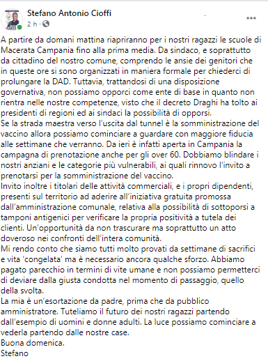 Questo il post pubblicato dal Sindaco di Macerata Campania Stefano Antonio Cioffi sulla sua pagina Facbook: "A partire da domani mattina riapriranno per i nostri ragazzi le scuole di Macerata Campania fino alla prima media. Da sindaco, e soprattutto da cittadino del nostro comune - si legge nel post - comprendo le ansie dei genitori che in queste ore si sono organizzati in maniera formale per chiederci di prolungare la DAD. Tuttavia, trattandosi di una disposizione governativa, non possiamo opporci come ente di base in quanto non rientra nelle nostre competenze, visto che il decreto Draghi ha tolto ai presidenti di regioni ed ai sindaci la possibilità di opporsi. Se la strada maestra - prosegue il post - verso l’uscita dal tunnel è la somministrazione del vaccino allora possiamo cominciare a guardare con maggiore fiducia alle settimane che verranno. Da ieri è infatti aperta in Campania la campagna di prenotazione anche per gli over 60. Dobbiamo blindare i nostri anziani e le categorie più vulnerabili, ai quali rinnovo l'invito a prenotarsi per la somministrazione del vaccino. Invito inoltre - prosegue il post - i titolari delle attività commerciali, e i propri dipendenti, presenti sul territorio ad aderire all’iniziativa gratuita promossa dall’amministrazione comunale, relativa alla possibilità di sottoporsi a tamponi antigenici per verificare la propria positività a tutela dei clienti. Un’opportunità - si legge ancora nel post - da non trascurare ma soprattutto un atto doveroso nei confronti dell’intera comunità. Mi rendo conto che siamo tutti molto provati da settimane di sacrifici e vita ‘congelata’ ma è necessario ancora qualche sforzo. Abbiamo pagato parecchio - prosegue il post - in termini di vite umane e non possiamo permetterci di deviare dalla giusta condotta nel momento di passaggio, quello della svolta. La mia è un’esortazione da padre, prima che da pubblico amministratore. Tuteliamo il futuro dei nostri ragazzi - si legge nel post - partendo dall’esempio di uomini e donne adulti. La luce possiamo cominciare a vederla partendo dalle nostre case. Buona domenica. Stefano".