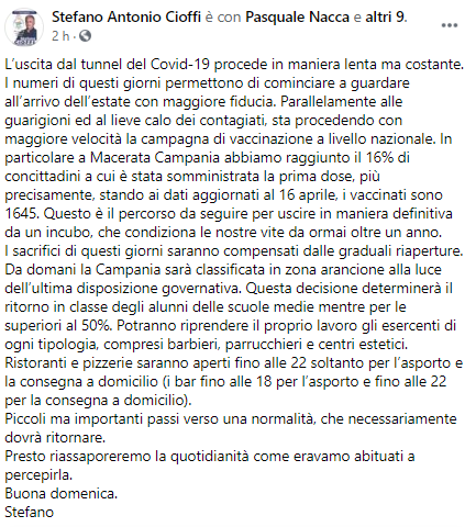 Questo il post pubblicato sulla sua pagina Facebook dal Sindaco di Macerata Campania Stefano Antonio Cioffi: "L’uscita dal tunnel del Covid-19 procede in maniera lenta ma costante. I numeri di questi giorni permettono di cominciare a guardare all’arrivo dell’estate con maggiore fiducia. Parallelamente alle guarigioni - si legge nel post - ed al lieve calo dei contagiati, sta procedendo con maggiore velocità la campagna di vaccinazione a livello nazionale. In particolare a Macerata Campania abbiamo raggiunto il 16% di concittadini a cui è stata somministrata la prima dose, più precisamente, stando ai dati aggiornati al 16 aprile, i vaccinati sono 1645. Questo è il percorso da seguire per uscire in maniera definitiva da un incubo, che .- prosegue il post - condiziona le nostre vite da ormai oltre un anno. I sacrifici di questi giorni saranno compensati dalle graduali riaperture. Da domani la Campania sarà classificata in zona arancione alla luce dell’ultima disposizione governativa. Questa decisione determinerà il ritorno in classe degli alunni delle scuole medie mentre per le superiori al 50%. Potranno riprendere il proprio lavoro - continua il Sindaco - gli esercenti di ogni tipologia, compresi barbieri, parrucchieri e centri estetici. Ristoranti e pizzerie saranno aperti fino alle 22 soltanto per l’asporto e la consegna a domicilio (i bar fino alle 18 per l’asporto e fino alle 22 per la consegna a domicilio). Piccoli ma importanti passi verso una normalità, che necessariamente dovrà ritornare. Presto riassaporeremo la quotidianità - conclude il post - come eravamo abituati a percepirla. Buona domenica. Stefano"