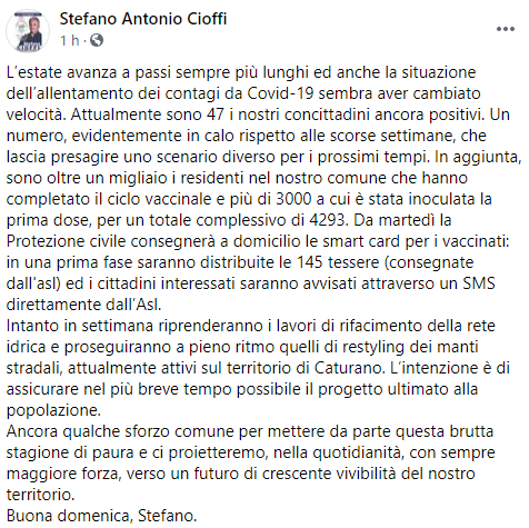 Questo il post pubblicato sulla sua pagina Facebook dal Sindaco di Macerata Campania Stefano Antonio Cioffi: "L’estate avanza a passi sempre più lunghi ed anche la situazione dell’allentamento dei contagi da Covid-19 sembra aver cambiato velocità. Attualmente sono 47 i nostri concittadini ancora positivi. Un numero, evidentemente in calo rispetto alle scorse settimane, che - si legge nel post - lascia presagire uno scenario diverso per i prossimi tempi. In aggiunta, sono oltre un migliaio i residenti nel nostro comune che hanno completato il ciclo vaccinale e più di 3000 a cui è stata inoculata la prima dose, per un totale complessivo di 4293. Da martedì la Protezione civile consegnerà a domicilio le smart card per i vaccinati: in una prima fase - prosegue il post - saranno distribuite le 145 tessere (consegnate dall'asl) ed i cittadini interessati saranno avvisati attraverso un SMS direttamente dall’Asl. Intanto in settimana riprenderanno i lavori di rifacimento della rete idrica e proseguiranno a pieno ritmo quelli di restyling dei manti stradali, attualmente attivi sul territorio di Caturano. L’intenzione - si legge ancora nel post - è di assicurare nel più breve tempo possibile il progetto ultimato alla popolazione. Ancora qualche sforzo comune per mettere da parte questa brutta stagione di paura e ci proietteremo, nella quotidianità, con sempre maggiore forza, verso un futuro - conclude il post - di crescente vivibilità del nostro territorio. Buona domenica, Stefano".