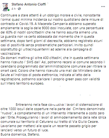 Questo parte del post pubblicato sulla sua pagina Facebook dal Sindaco di Macerata Campania Stefano Antonio Cioffi: "Continuare a stare attenti è un obbligo morale e civile, nonostante l’ormai quasi minima incidenza sul nostro quotidiano delle misure di contrasto al Covid-19. A Macerata Campania abbiamo superato ampiamente la soglia delle 9000 dosi inoculate - si legge nel post - con una percentuale del 60% di nostri concittadini che ne hanno assunta almeno una. La guardia non va certo abbassata dal momento che in questa settimana, dopo tanti giorni di decrescita, abbiamo registrato alcuni casi di positività senza problematiche particolari. Invito quindi soprattutto gli ultracinquantenni ad aderire alla campagna di vaccinazione. Da domani mattina gli oltre 400 cittadini - prosegue il post - che in questa settimana hanno ricevuto l' SMS dall' Asl, potranno recarsi al comune secondo il calendario programmato dall’amministrazione comunale per ritirare la smart card. Coloro che hanno ricevuto una mail - si legge ancora - dal Ministero della Salute all’indirizzo di posta elettronica, indicata all’atto della registrazione, potranno scaricare il proprio green pass con validità sull’intero territorio europeo. (...). Entreranno nella fase conclusiva i lavori di sistemazione di oltre 1000 loculi delle coperture nella parte del Cimitero denominato "nuovo", a completamento di un intervento interamente a costo zero per l’Ente. Proseguiranno - si legge ancora - i lavori di ammodernamento della rete idrica comunale sul territorio di Caturano sul tratto di Via Giulio Cesare. Lavoriamo per metterci alle spalle un recente passato grigio per lanciarci verso un futuro di luce. Buona domenica, Stefano".