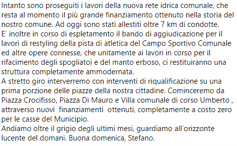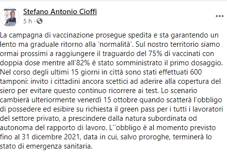 Questo il post pubblicato sulla sua pagina Facebook dal Sindaco di Macerata Campania Stefano Antonio Cioffi: "La campagna di vaccinazione prosegue spedita e sta garantendo un lento ma graduale ritorno alla ‘normalità’. Sul nostro territorio siamo ormai prossimi a raggiungere il traguardo del 75% di vaccinati con doppia dose mentre all’82% è stato somministrato il primo dosaggio. Nel corso degli ultimi 15 giorni - si legge nel post - in città sono stati effettuati 600 tamponi: invito i cittadini ancora scettici ad aderire alla copertura del siero per evitare questo continuo ricorrere ai test. Lo scenario cambierà ulteriormente venerdì 15 ottobre quando scatterà l’obbligo di possedere ed esibire su richiesta il green pass per i tutti i lavoratori del settore privato, a prescindere dalla natura subordinata od autonoma del rapporto di lavoro. L’’obbligo - prosegue il post - è al momento previsto fino al 31 dicembre 2021, data in cui, salvo proroghe, terminerà lo stato di emergenza sanitaria. Intanto sono proseguiti i lavori della nuova rete idrica comunale, che resta al momento il più grande finanziamento ottenuto nella storia del nostro comune. Ad oggi sono stati allestiti - si legge ancora - oltre 7 km di condotte. E’ inoltre in corso di espletamento il bando di aggiudicazione per il lavori di restyling della pista di atletica del Campo Sportivo Comunale ed altre opere connesse, che unitamente ai lavori in corso per il rifacimento degli spogliatoi - si legge ancora - e del manto erboso, ci restituiranno una struttura completamente ammodernata. A stretto giro interverremo con interventi di riqualificazione su una prima porzione delle piazze della nostra cittadine. Cominceremo da Piazza Crocifisso, Piazza Di Mauro e Villa comunale di corso Umberto , attraverso nuovi finanziamenti ottenuti, completamente a costo zero per le casse del Municipio. Andiamo oltre il grigio - conclude il post - degli ultimi mesi, guardiamo all’orizzonte lucente del domani. Buona domenica, Stefano".