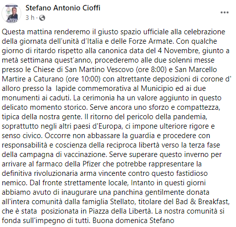 Questo il post pubblicato sulla sua pagina Facebook dal Sindaco di Macerata Campania: "Questa mattina renderemo il giusto spazio ufficiale alla celebrazione della giornata dell’unità d’Italia e delle Forze Armate. Con qualche giorno di ritardo rispetto alla canonica data del 4 Novembre, giunto a metà settimana quest’anno - si legge nel comunicato - procederemo alle due solenni messe presso le Chiese di San Martino Vescovo (ore 8:00) e San Marcello Martire a Caturano (ore 10:00) con altrettante deposizioni di corone d' alloro presso la lapide commemorativa al Municipio ed ai due monumenti ai caduti. La cerimonia ha un valore aggiunto in questo delicato momento storico. Serve ancora uno sforzo e compattezza, tipica della nostra gente. Il ritorno del pericolo della pandemia - prosegue il comunicato - soprattutto negli altri paesi d'Europa, ci impone ulteriore rigore e senso civico. Occorre non abbassare la guardia e procedere con responsabilità e coscienza della reciproca libertà verso la terza fase della campagna di vaccinazione. Serve superare questo inverno per arrivare al farmaco della Pfizer che potrebbe rappresentare la definitiva rivoluzionaria arma vincente contro questo fastidioso nemico. Dal fronte strettamente locale. Intanto - si legge ancora - in questi giorni abbiamo avuto di inaugurare una panchina gentilmente donata all'intera comunità dalla famiglia Stellato, titolare del Bad & Breakfast, che è stata posizionata in Piazza della Libertà. La nostra comunità si fonda sull'impegno di tutti. Buona domenica Stefano".