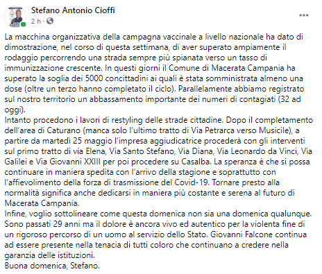Questo il post pubblicato sulla sua pagina Facebook dal Sindaco di Macerata Campania Stefano Antonio Cioffi: "La macchina organizzativa della campagna vaccinale a livello nazionale ha dato di dimostrazione, nel corso di questa settimana, di aver superato ampiamente il rodaggio percorrendo una strada sempre più spianata - si legge nel post - verso un tasso di immunizzazione crescente. In questi giorni il Comune di Macerata Campania ha superato la soglia dei 5000 concittadini ai quali è stata somministrata almeno una dose (oltre un terzo hanno completato il ciclo). Parallelamente abbiamo registrato sul nostro territorio un abbassamento importante dei numeri di contagiati (32 ad oggi). Intanto - prosegue il post - procedono i lavori di restyling delle strade cittadine. Dopo il completamento dell’area di Caturano (manca solo l'ultimo tratto di Via Petrarca verso Musicile), a partire da martedì 25 maggio l’impresa aggiudicatrice procederà con gli interventi sul primo tratto di via Elena, Via Santo Stefano, Via Diana, Via Leonardo da Vinci, Via Galilei e Via Giovanni XXIII per poi procedere su Casalba. La speranza - si legge ancora nel post - è che si possa continuare in maniera spedita con l’arrivo della stagione e soprattutto con l’affievolimento della forza di trasmissione del Covid-19. Tornare presto alla normalità significa anche dedicarsi in maniera più costante e serena al futuro di Macerata Campania. Infine, voglio sottolineare come questa domenica non sia una domenica qualunque. Sono passati 29 anni ma il dolore è ancora vivo ed autentico per la violenta fine di un rigoroso percorso di un uomo al servizio dello Stato. Giovanni Falcone - conclude il sindaco - continua ad essere presente nella tenacia di tutti coloro che continuano a credere nella garanzia delle istituzioni. Buona domenica, Stefano".