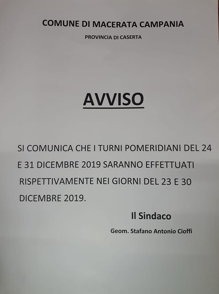 Questo quanto comunicato dal Comune di Macerata Campania