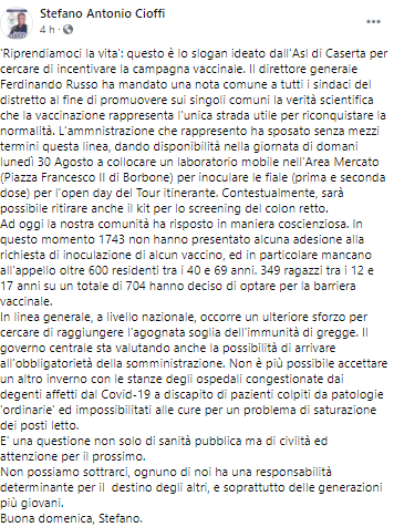 Questo il post pubblicato sulla sua pagina Facebook dal Sindaco di Macerata Campania Stefano Antonio Cioffi: "'Riprendiamoci la vita': questo è lo slogan ideato dall'Asl di Caserta per cercare di incentivare la campagna vaccinale. Il direttore generale Ferdinando Russo ha mandato una nota comune a tutti i sindaci del distretto al fine di promuovere - si legge nel post - sui singoli comuni la verità scientifica che la vaccinazione rappresenta l'unica strada utile per riconquistare la normalità. L'ammnistrazione che rappresento ha sposato senza mezzi termini questa linea, dando disponibilità nella giornata di domani lunedì 30 Agosto - si legge ancora - a collocare un laboratorio mobile nell'Area Mercato (Piazza Francesco II di Borbone) per inoculare le fiale (prima e seconda dose) per l'open day del Tour itinerante. Contestualmente, sarà possibile ritirare anche il kit per lo screening del colon retto. Ad oggi la nostra comunità ha risposto in maniera coscienziosa. In questo momento - si legge - 1743 non hanno presentato alcuna adesione alla richiesta di inoculazione di alcun vaccino, ed in particolare mancano all'appello oltre 600 residenti tra i 40 e 69 anni. 349 ragazzi tra i 12 e 17 anni su un totale di 704 hanno deciso di optare per la barriera vaccinale. In linea generale, a livello nazionale, occorre un ulteriore sforzo per cercare di raggiungere l'agognata soglia dell'immunità di gregge. Il governo centrale - prosegue il Sindaco - sta valutando anche la possibilità di arrivare all'obbligatorietà della somministrazione. Non è più possibile accettare un altro inverno con le stanze degli ospedali congestionate dai degenti affetti dal Covid-19 a discapito di pazienti colpiti da patologie 'ordinarie' ed impossibilitati alle cure per un problema di saturazione dei posti letto. E' una questione - si legge - non solo di sanità pubblica ma di civiltà ed attenzione per il prossimo. Non possiamo sottrarci, ognuno di noi ha una responsabilità determinante per il destino degli altri, e soprattutto delle generazioni più giovani. Buona domenica, Stefano".