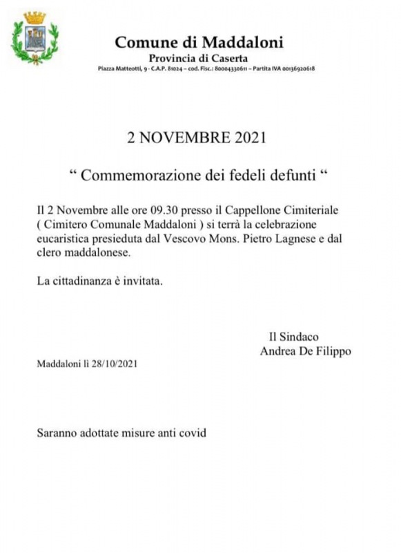Questo quanto apprendiamo dal Comune di Maddaloni in merito alla Commemorazione dei fedeli defunti