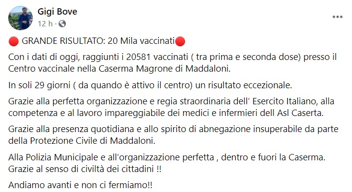 Questo quanto apprendiamo dalla pagina fb del Vice Sindaco di Maddaloni Gigi Bove: "GRANDE RISULTATO: 20 Mila vaccinati Con i dati di oggi, raggiunti i 20581 vaccinati ( tra prima e seconda dose) presso il Centro vaccinale nella Caserma Magrone di Maddaloni. In soli 29 giorni ( da quando è attivo il centro) un risultato eccezionale. Grazie alla perfetta organizzazione e regia straordinaria dell’ Esercito Italiano, alla competenza e al lavoro impareggiabile dei medici e infermieri dell Asl Caserta. Grazie alla presenza quotidiana e allo spirito di abnegazione insuperabile da parte della Protezione Civile di Maddaloni. Alla Polizia Municipale e all’organizzazione perfetta , dentro e fuori la Caserma. Grazie al senso di civiltà dei cittadini !! Andiamo avanti e non ci fermiamo!!"