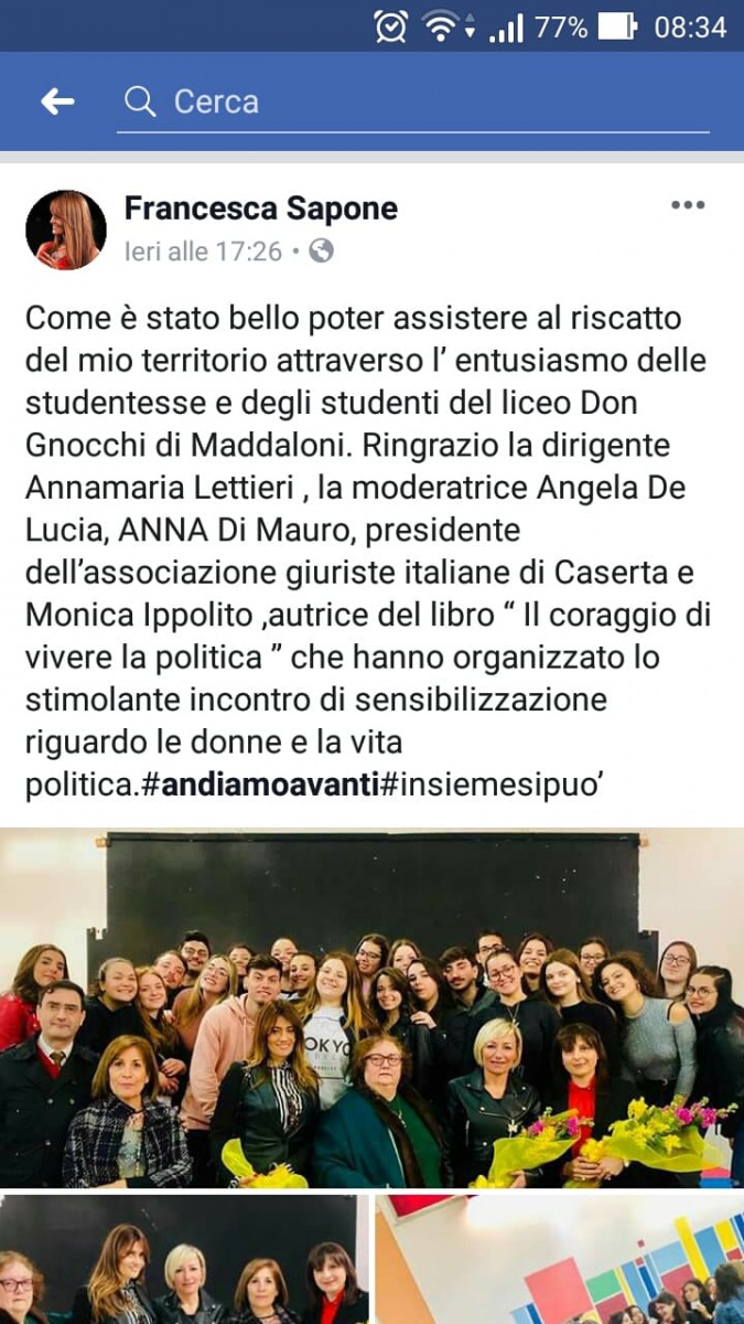 All'Istituto scolastico Don Gnocchi di Maddaloni si è discusso del ruolo della donna in politica, con la presentazione del libro 'Il coraggio di vivere la politica' dell'autrice Monica Ippolito. Presenti anche la Dirigente scolastica Annamaria Lettieri, e il consigliere alle pari opportunità della Provincia di Caserta Francesca Sapone.
