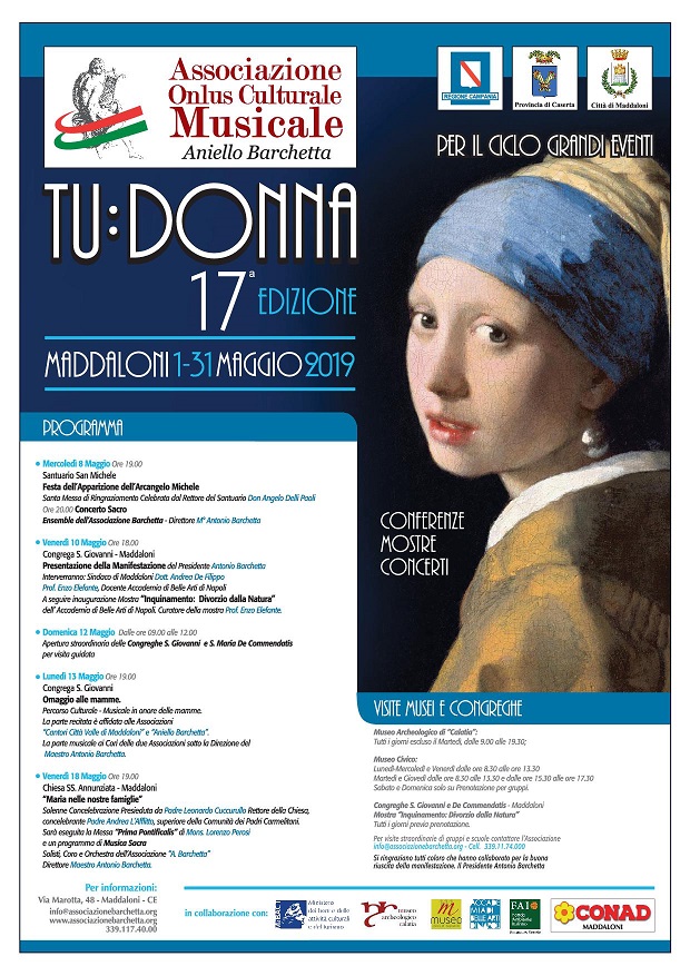 La serie di fortunati appuntamenti gode del patrocinio della Regione Campania, della Provincia di Caserta e del Comune di Maddaloni. Si legge nel comunicato. L’evento è realizzato in collaborazione con il Ministero dei beni culturali e del turismo – Polo Museale della Campania – Museo Archeologico Nazionale Calatia, Museo Civico di Maddaloni, Accademia delle Belle Arti di Napoli, FAI – Fondo Ambiente Italiano e la Conad di Maddaloni. Piuttosto ricca la programmazione di “TU: DONNA 2019” giunta alla sua diciassettesima edizione. Si legge nel comunicato. Il primo appuntamento in ordine temporale è quello di mercoledì 8 maggio 2019 presso il Santuario San Michele in Maddaloni in occasione della Festa dell’Apparizione dell’Arcangelo Michele. Il programma prevede alle ore 19.00 la Santa Messa di Ringraziamento Celebrata dal Rettore del Santuario Don Angelo Delli Paoli, e a seguire alle ore 20.00 - si legge nel comunicato - il Concerto Sacro “Ensemble dell’Associazione Barchetta” sotto la direzione del Maestro Antonio Barchetta. A seguire l’appuntamento è per venerdì 10 maggio 2019 presso la Congrega S. Giovanni dove alle ore 18.00 - si legge nel comunicato - ci sarà la Presentazione della Manifestazione da parte del Presidente del sodalizio promotore, il Maestro Antonio Barchetta. Interverranno il Sindaco di Maddaloni Andrea De Filippo, il Prof. Enzo Elefante, docente Accademia di Belle Arti di Napoli. Si legge nel comunicato. A seguire vi sarà l’inaugurazione Mostra “Inquinamento: Divorzio dalla Natura” dell’Accademia di Belle Arti di Napoli di cui è curatore il Maestro Prof. Enzo Elefante. Proseguendo nel programma è previsto per domenica 12 maggio 2019 dalle ore 09.00 alle ore 12.00 l’apertura straordinaria della Congreghe S. Giovanni e De Commendatis per visita guidata. Passando a lunedì 13 maggio 2019 presso la Congrega S. Giovanni alle ore 19.00 - si legge nel comunicato - ci sarà un Omaggio alle mamme con un percorso Culturale – Musicale in onore delle mamme. La parte recitata è affidata alle Associazioni “Cantori Città Valle di Maddaloni” e “Aniello Barchetta”. La parte musicale ai Cori delle due Associazioni sotto la Direzione del Maestro Antonio Barchetta. SI giunge dunque all’appuntamento festivo per il sodalizio promotore ovvero al giorno venerdì 18 maggio 2019 - si legge nel comunicato - allorquando presso la chiesa SS. Annunziata alle ore 19.00 ci sarà l’evento “Maria nelle nostre famiglie” ovvero la Solenne Concelebrazione Presieduta da Padre Leonardo Cuccurullo Rettore della Chiesa, concelebrante Padre Andrea L’Afflitto, superiore della Comunità dei Padri Carmelitani. Si legge nel comunicato. Sarà eseguita la Messa “Prima Pontificalis” di Mons. Lorenzo Perosi e un programma di Musica Sacra con Solisti, Coro e Orchestra dell’Associazione “A. Barchetta” sotto la direzione del Maestro Antonio Barchetta."