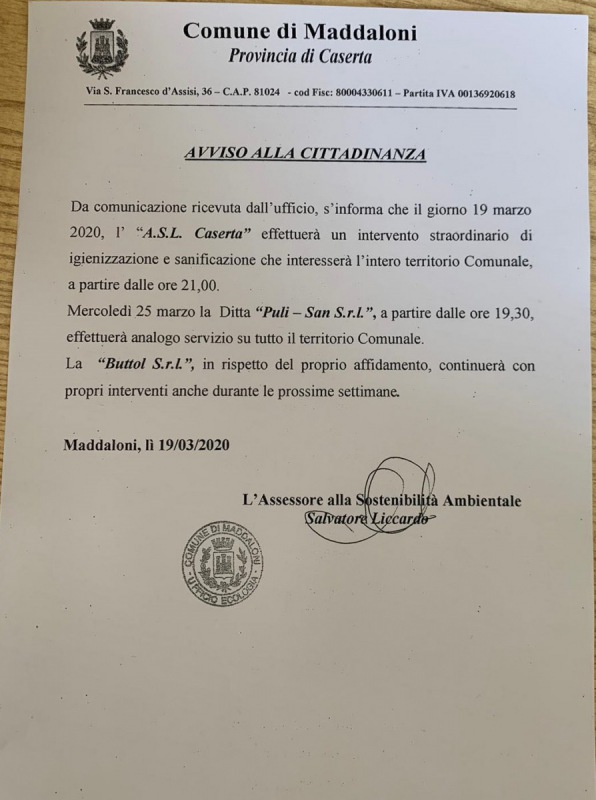 Questo il documento riguardante le prossime date di igienizzazione e sanificazione del territorio di Maddaloni