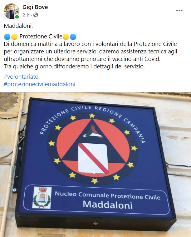 "Protezione Civile. Di domenica mattina a lavoro con i volontari della Protezione Civile per organizzare un ulteriore servizio: daremo assistenza tecnica- si legge nella nota- agli ultraottantenni che dovranno prenotare il vaccino anti Covid. Tra qualche giorno diffonderemo i dettagli del servizio. #volontariato #protezionecivilemaddaloni"