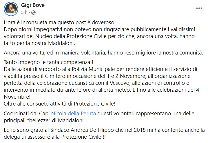 Questo quanto apprendiamo dalla pagina fb del Vice Sindaco di Maddaloni Gigi Bove: "L’ora è inconsueta ma questo post è doveroso. Dopo giorni impegnativi non potevo non ringraziare pubblicamente i validissimi volontari del Nucleo della Protezione Civile per ciò che, ancora una volta, hanno fatto per la nostra Maddaloni - si legge nella nota -. Ancora una volta, ed in maniera volontaria, hanno reso migliore la nostra comunità. Tanto impegno e tanta competenza!! Dalle azioni di supporto alla Polizia Municipale per rendere efficiente il servizio di viabilità presso il Cimitero in occasione del 1 e 2 Novembre; all’organizzazione perfetta della celebrazione eucaristica con il Vescovo; alle azioni di controllo e intervento immediato durante le ore di allerta meteo. E fino alle celebrazioni del 4 Novembre! Oltre - si legge nella nota - alle consuete attività di Protezione Civile! Coordinati dal Cap. Nicola della Peruta questi volontari rappresentano una delle principali “bellezze” di Maddaloni! Ed io sono grato al Sindaco Andrea De Filippo che nel 2018 mi ha conferito anche la delega di assessore alla Protezione Civile!!".