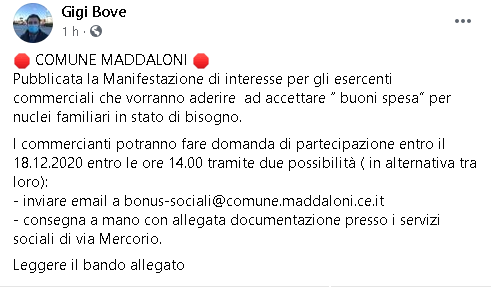 Lo apprendiamo dalla pagina Facebook del ViceSindaco di Maddaloni, Gigi Bove.