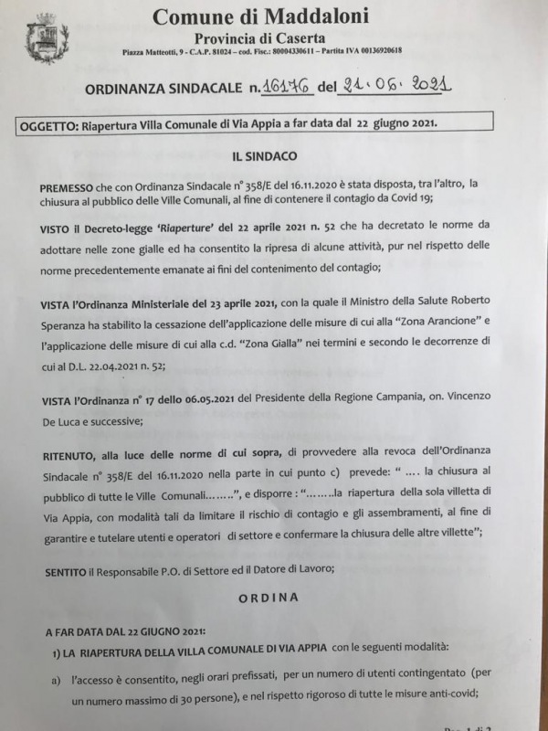 Questa l'ordinanza da poco firmata dal Sindaco di Maddaloni Andrea De Filippo