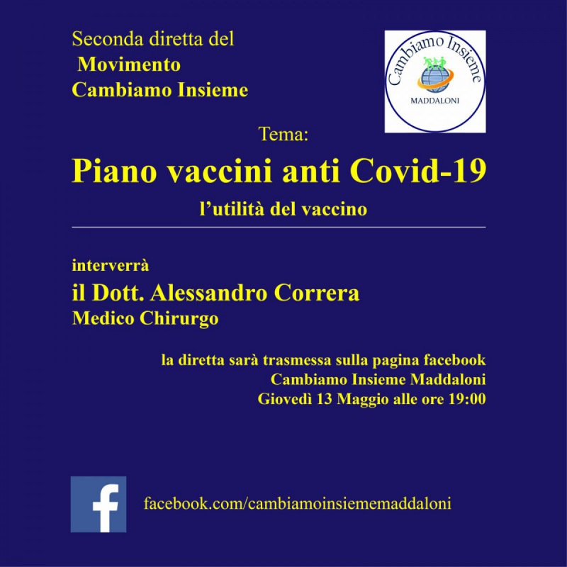 Si terrà giovedì 13 maggio, alle ore 19, la diretta facebook sulla pagina del Movimento 'Cambiamo Insieme' di Maddaloni che avrà il tema: "Piano vaccini anti Covid-19. L'utilità del vaccino". All'appuntamento interverrà anche il medico chirurgo Alessandro Correra.