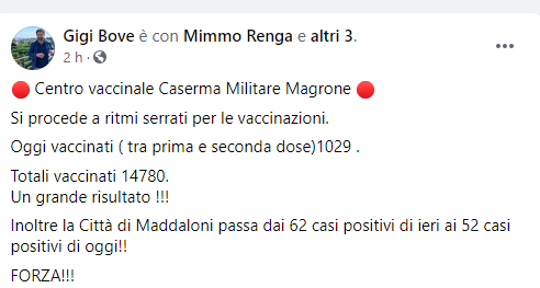 Questo il post pubblicato sulla sua pagina Facebook dal Vicesindaco di Maddaloni Luigi Bove: "Centro vaccinale Caserma Militare Magrone. Si procede a ritmi serrati per le vaccinazioni. Oggi vaccinati ( tra prima e seconda dose) 1029. Totali vaccinati 14780.