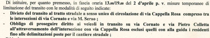 Apprendiamo l'ordinanza del Comune di Maddaloni che prevede la limitazione temporanea al traffico di via Cappella Rosa in data 2 aprile. Questo parte del testo.