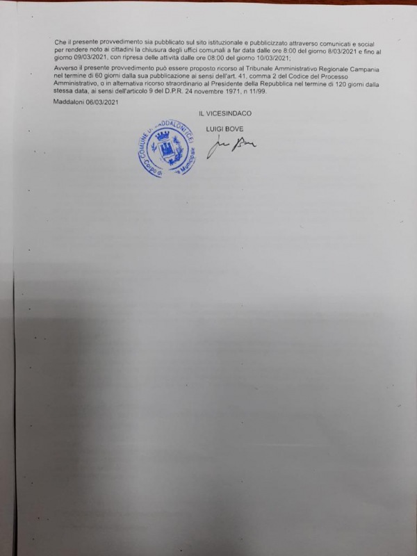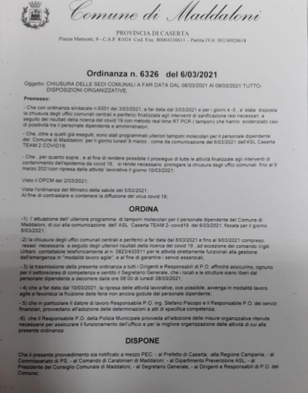 Pubblichaimo il testo dell'ordinanza emessa oggi dal Comune di Maddaloni.