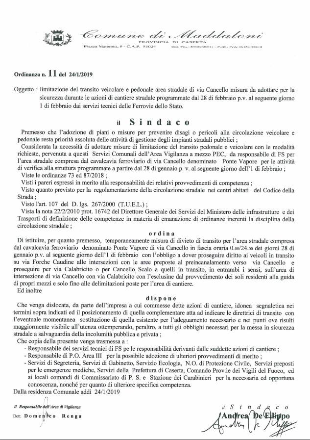 Questa l'ordinanza del Sindaco Andrea De Filippo con la quale si vieta il transito del cavalcavia ferroviario denominato Ponte Vapore dalla mezzanotte di lunedì 28 gennaio e sino all'1 febbraio per via di attività di verifica della struttura programmate da Ferrovie dello Stato.