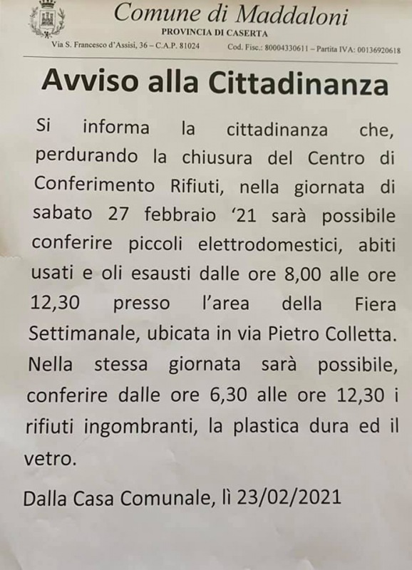 Questo quanto comunicato dal Comune di Maddaloni in merito al conferimento di rifiuti quali piccoli elettrodomestici, abiti usati e oli esausti previsto per sabato 27 febbraio presso l'area fiera settimanale.