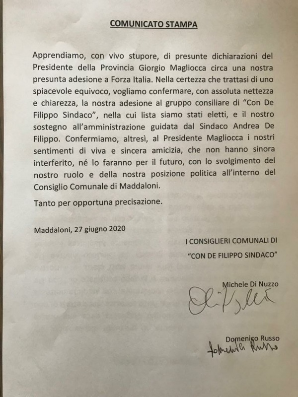 Di seguito, il testo del comunicato dei Consiglieri Comunali di "Con De Filippo Sindaco" di Maddaloni, Michele Di Nuzzo e Domenico Russo, giunto in redazione.