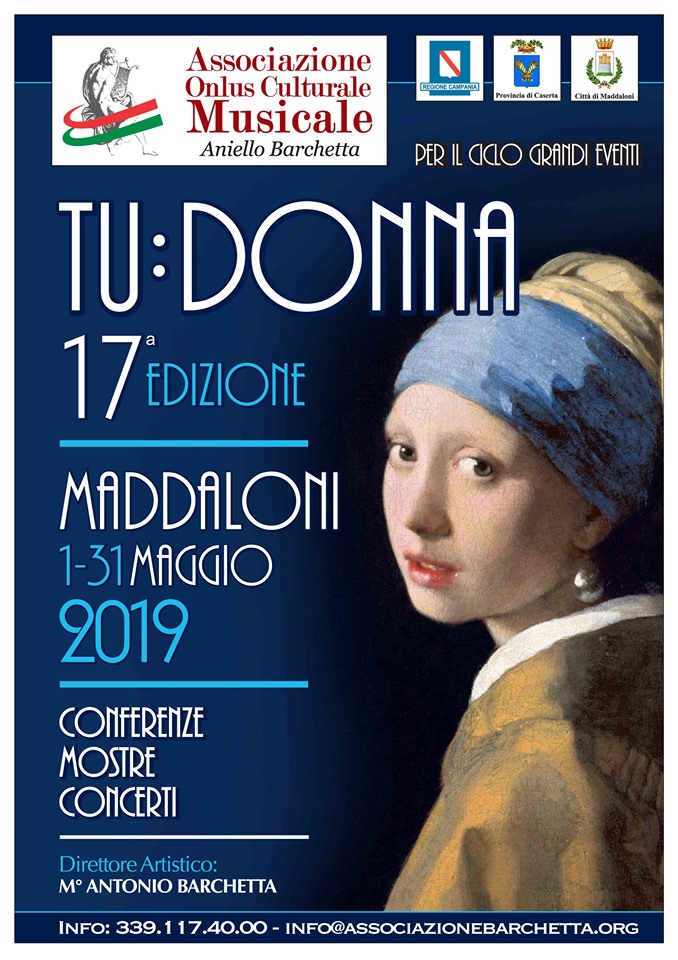 "Domani sera importante appuntamento per la ricca programmazione, del ciclo Grandi Eventi, della kermesse “Tu Donna” 2019 giunta alla 17 edizione promossa dal Maestro Antonio Barchetta e dal suo sodalizio Associazione Culturale Musicale Onlus“Aniello Barchetta” che prevede Conferenze, - si legge nel comunicato - Mostre e Concerti con il patrocinio della Regione Campania, della Provincia di Caserta e del Comune di Maddaloni; e sono realizzate in collaborazione con il Ministero dei beni culturali e del turismo – Polo Museale della Campania – Museo Archeologico Nazionale Calatia, Museo Civico di Maddaloni, Accademia delle Belle Arti di Napoli, FAI – Fondo Ambiente Italiano e la Conad di Maddaloni.