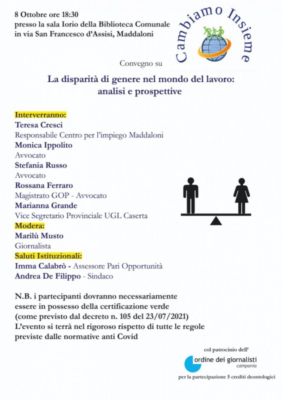 "Il Movimento Civico “Cambiamo Insieme” di Maddaloni, guidato dal vice sindaco Luigi Bove e dal Consigliere Comunale Salvatore Pasquale De Rosa, presenta una nuova iniziativa. Infatti il Movimento ha organizzato, per Venerdì 8 Ottobre dalle ore 18.30 , un convegno dall’interessante tematica sociale: “La disparità di genere nel mondo del lavoro : analisi e prospettive”. L’incontro, si legge nella nota- si terrà presso la Sala Iorio della Biblioteca Comunale di via San Francesco d’Assisi e sarà moderato dalla Giornalista Marilù Musto. Ci saranno innanzitutto gli interventi istituzionali del Sindaco di Maddaloni Andrea De Filippo e dell’assessore Comunale alle pari opportunità Imma Calabrò. I relatori sono tutti al femminile e riguardano esponenti di varie professioni : Teresa Cresci Responsabile del Centro per l’impiego di Maddaloni , gli avvocati Stefania Russo e Monica Ippolito (già quest'ultima animatrice di varie associazioni culturali ed ex assessore comunale), L’ Avv. Rossana Ferraro Magistrato GOP e Marianna Grande vice segretario provinciale dell Ugl Caserta. Inoltre- si legge nella nota- durante il convegno saranno illustrati anche elaborati multimediali da parte di associazioni culturali. Il Movimento Cambiamo Insieme terrà il convegno nel rispetto delle regole e dei decreti anti Covid e la partecipazione allo stesso varrà come punti di crediti formativi deontologici per l’ordine dei giornalisti della Regione Campania."