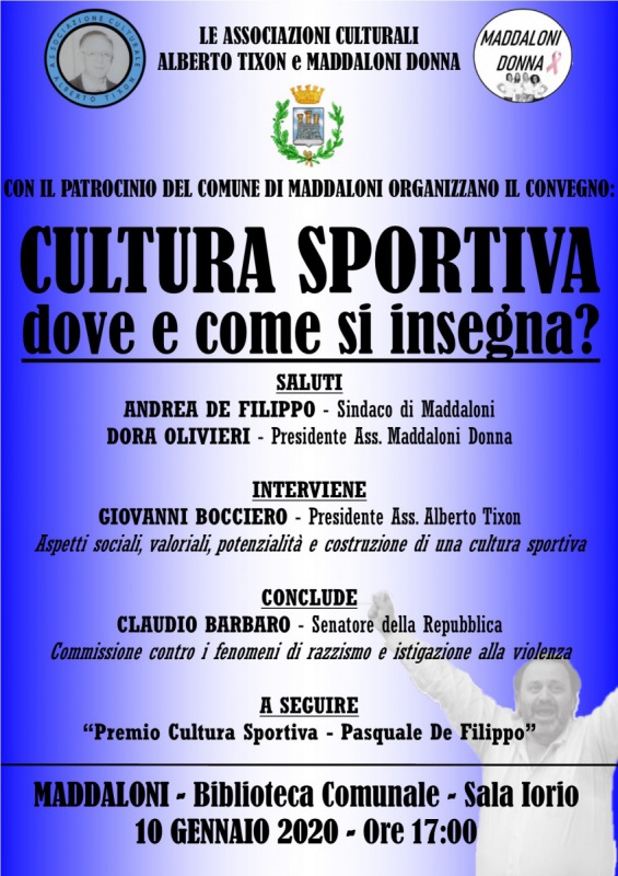 Pubblichiamo questa nota stampa delle associazioni Alberto Tixon e Maddaloni Donna: "Continuano gli approfondimenti sul tema dello sport e della cultura sportiva delle associazioni sorelle ‘Alberto Tixon’ e ‘Maddaloni Donna’. Venerdì 10 gennaio 2020 alle ore 17 presso la sala Iorio della biblioteca comunale si svolgerà il convegno ‘Cultura sportiva – dove e come si insegna?’. Ad aprire l’evento - si legge nella nota - saranno i saluti del sindaco di Maddaloni Andrea De Filippo e della presidente dell’associazione ‘Maddaloni Donna’ Dora Olivieri. Seguirà poi l’intervento di Giovanni Bocciero, presidente dell’associazione ‘Alberto Tixon’, dal titolo ‘Aspetti sociali, valoriali, potenzialità e costruzione di una cultura sportiva’. A conclusione del convegno ci sarà l’intervento del senatore Claudio Barbaro, amico delle due associazioni, che tratterà del tema ‘Commissione contro i fenomeni di razzismo e istigazione alla violenza’. Chiuderà l’evento il ricordo di un uomo che tanto ha dato allo sport maddalonese - si legge nella nota - ovvero il ‘Premio Cultura Sportiva – Pasquale De Filippo’. “Il convegno sulla cultura dello sport – ha dichiarato Giovanni Bocciero – sarà un momento in cui si proverà a rispondere ad alcune domande cercando di capire cosa possa essere una cultura sportiva, se in Italia esiste una cultura sportiva, carpendo quelli che sono gli aspetti sociali, valoriali che fanno parte di questa realtà. Si discuterà quindi di quelli che sono i giusti comportamenti che tutti gli attori del mondo sportivo dovrebbero rispettare ed ancora sulle tipologie di sfide che dovrebbero contribuire a creare una mentalità vincente. A corollario di questo appuntamento - si legge nella nota - si ricorderà la figura di Pasquale De Filippo, scomparso pochi mesi fa, che, per chi l’ha conosciuto, è stata una persona dalla grande cultura sportiva che non si limitava a guardare il risultato fine a sé stesso, ma che guardava anche oltre, ovvero a cosa quel risultato poteva portare ed al percorso che si era svolto per arrivare a quel traguardo”. “Il Convegno sulla cultura sportiva del 10 Gennaio – ha dichiarato Dora Olivieri - ha l'onore di ospitare di nuovo come relatore il Senatore Dottore Barbaro, responsabile della presentazione della Riforma sullo Sport. Bello ed emozionante il premio ‘Cultura Sportiva’ alla memoria di Pasquale De Filippo venuto a mancare da poco e che in questo settore ha dedicato molto del suo tempo. Come si legge sulla nostra locandina, l'evento ha la finalità di far capire che lo Sport è una risorsa culturale ed educativa - si legge nella nota -, non solo competizione. Sono dell'idea che per uno Sport formativo è necessario che si pratichi a scuola fin dall'asilo, perché il bambino non viva solo la gioia del gioco, ma impari a stare insieme con gli altri con rispetto, evitando forme di violenza in futuro attraverso la cultura della Bellezza”.