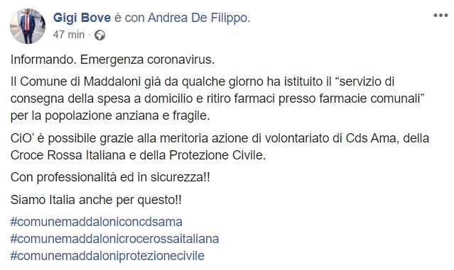 Questo quanto pubblicato sulla pagina facebook del Vicesindaco Bove:
