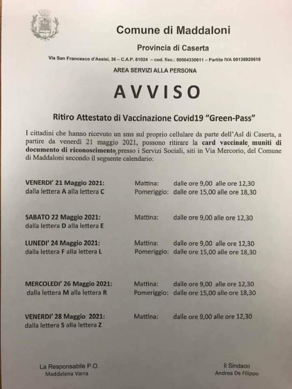 Da venerdì 21 maggio anche presso il Comune di Maddaloni si potrà ritirare il green pass, ovvero il certificato di vaccinazione Covid-19. Di seguito il calendario per ordine alfabetico.