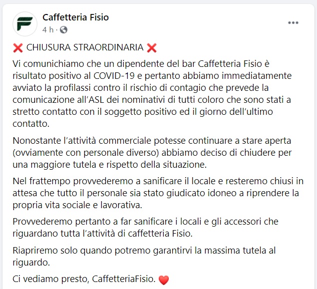 Questo quanto pubblicato sulla pagina fb della Caffetteria Fisio