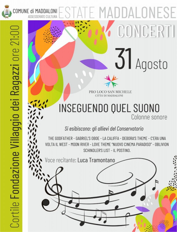 Questo il comunicato stampa diffuso da 'Estate maddalonese': "Martedì, 31 Agosto p.v., alle ore 21.00, nello storico Cortile della Fondazione Villaggio dei Ragazzi, si terrà l’evento musicale: “Inseguendo quel suono”. Organizzato dal Comune di Maddaloni nella persona dell’assessore alla cultura Caterina Ventrone, la manifestazione rientra nella serie - si legge nel comunicato - di iniziative culturali denominata “Estate maddalonese” e vede la partecipazione anche della Proloco San Michele. La serata, che si caratterizzerà per l’esecuzione di un repertorio di musiche ad opera degli ex allievi del già Liceo Musicale Villaggio dei Ragazzi, sarà allietata - si legge ancora - dalla voce narrante di Luca Tramontano. “Prosegue a ritmo incalzante - ha dichiarato Felicio De Luca, Commissario straordinario della Fondazione Villaggio dei Ragazzi - la collaborazione con il Comune di Maddaloni e le varie associazioni territoriali per promuovere eventi culturali importanti per il territorio - conclude il comunicato - quale strumenti per il miglioramento della qualità della vita e della coesione sociale".