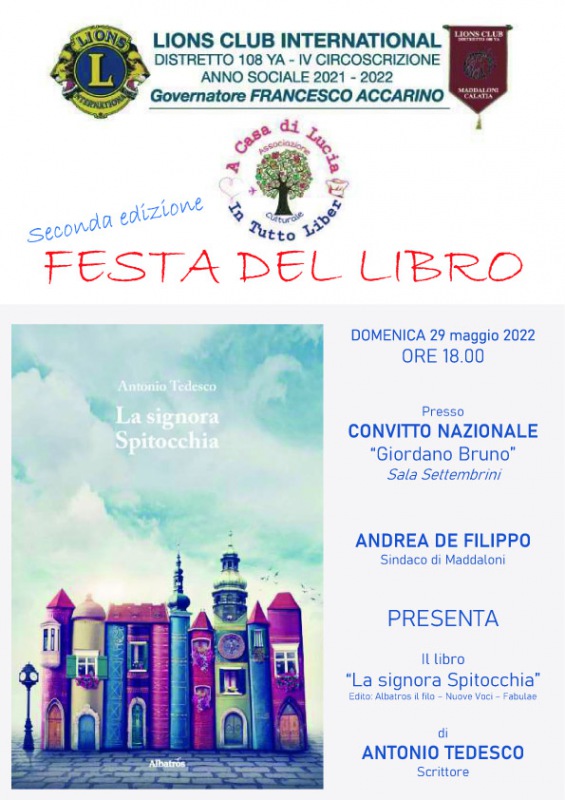Questo il comunicato stampa diffuso da Lions Club International: "Domenica 29 maggio, alle ore 18.00, presso il Convitto Nazionale “Giordano Bruno”, grazie al Lions Club International, sarà presentato il libro “La signora Spitocchia” di Antonio Tedesco, edito dal Gruppo Albatros – il filo. A presentare il libro sarà Andrea De Filippo - si legge nel comunicato - (Sindaco di Maddaloni) e amico di vecchia data dell’autore. Il libro è già in libreria dal mese di febbraio e sta riscuotendo un ottimo riscontro di pubblico e di critica, tra l’atro è stato presente anche alla fiera Internazionale del Libro di Torino che si è tenuta dal 19 al 23 maggio scorso. La signora Spitocchia in pochi mesi è diventata - prosegue il comunicato - un vero e proprio personaggio e tutti ne vogliono parlare. La vicenda si svolge nel villaggio di Megghol Wilk, dove sembra che la pace regni sovrana, ma tutto è destinato a cambiare, con l’arrivo della signora Spitocchia, detta anche miss tempesta, un personaggio strano con molte sfaccettature e soprattutto con un egocentrismo da far paura. Fulmini, saette, venti e pioggia si abbatteranno sul villaggio e metteranno sottosopra ogni cosa, soprattutto nuove regole sconvolgeranno l’antica armonia. Nuovi intrighi e nuove alleanze, si formeranno affinché ogni cambiamento seppur avvenga, rimanga uguale a se stesso. Dunque si tratta di una fiaba dal sapore antico - si legge ancora nel comunicato - in cui si susseguono fatti e misfatti che normalmente avvengono nella vita di tutti i giorni, ovviamente il tutto senza scomodare la nostra vita quotidiana. La signora Spitocchia con il suo caratteraccio e i suoi modi di fare al quanto surreali e incomprensibili è stata paragonata ad una Mery Poppins al contrario, altri ancora l’hanno paragonata a Crudelia Demon, oppure alla signora Trinciabue nel romanzo Matilde, di Roald Dahl. Nel suo insieme la fiaba è stata assimilata al “Signore degli anelli” o “Harry Potter” per le sue ambientazioni, mentre riferimenti più contenutistici sono stati riferiti all’opera teatrale “La peste” in “Lo Stato d’assedio” di Albert Camus - prosegue il comunicato - del 1948, in cui nonostante il dramma della paura attuato dai regimi totalitari, l’opera ha dei risvolti tragicomici in cui i personaggi appaiono esagerati e grotteschi, dove l’autore affronta in modo esplicito i temi della resistenza e dell’uguaglianza sociale, contro ogni forma di sottomissione, rassegnazione, passività e contro lo scendere a patti con il tiranno di turno. Dunque, “La signora Spitocchia” pubblicata dal Gruppo Albatros – il filo nella sezione Fabulae - Nuove Voci, con una interessante prefazione - si legge ancora - di Barbara Alberti, sta avendo un buon riscontro di pubblico e di critica grazie anche ai vari articoli e diverse interviste che in questi primi mesi si sono succedute su diversi giornali e reti televisive e social, partecipando a trasmissioni come, Se scrivendo, Dieci libri, Conoscere TV e altre andate in onda su canali Sky, ricevendo tra l’altro migliaia di visualizzazioni. Il libro - prosegue il comunicato - lo si può trovare in libreria e sui maggiori store on line".