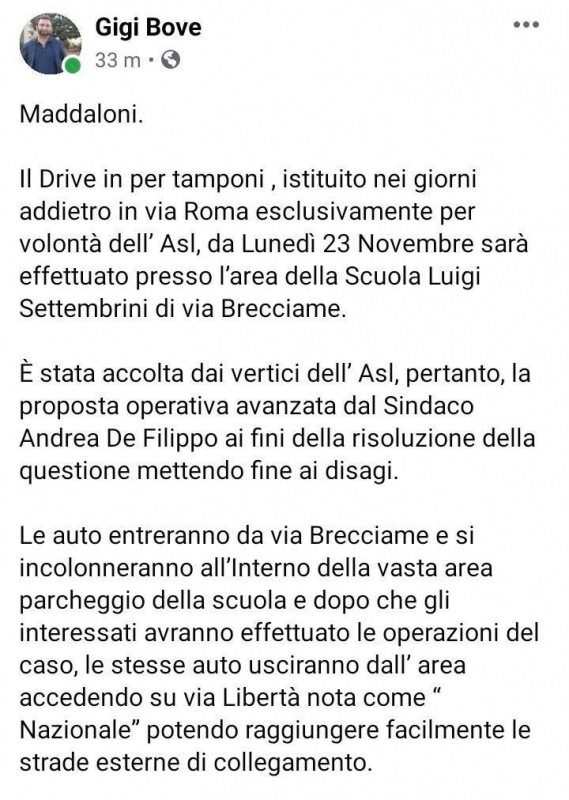 Questo quanto pubblicato su fb dal Vicesidnaco Bove