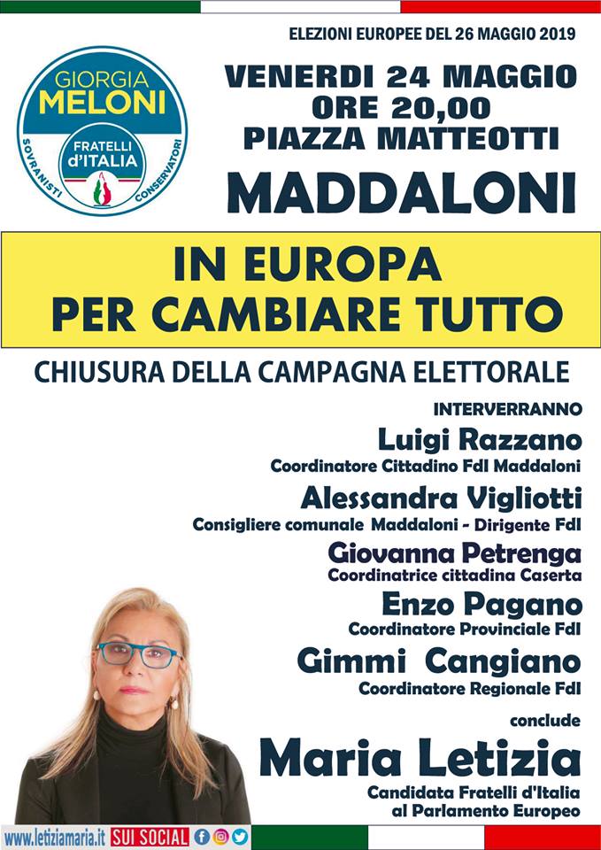Questa sera a Maddaloni ci saranno varie chiusure della campagna elettorale per le Europee. E' soprottutto il centrodestra ad essere attivo, con Lega e Fratelli d'Italia che scenderanno in piazza.