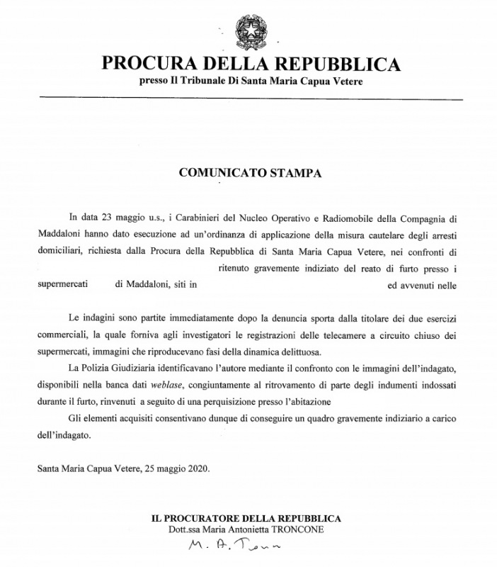 Questa la nota stampa del Comando Provinciale dei Carabinieri di Caserta: