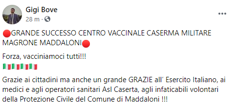 Questo il post pubblicato sulla sua pagina Facebook dal Vicesindaco di Maddaloni Gigi Bove: "GRANDE SUCCESSO CENTRO VACCINALE CASERMA MILITARE MAGRONE MADDALONI. Forza, vacciniamoci tutti!!!Grazie ai cittadini - si legge - ma anche un grande GRAZIE all’ Esercito Italiano, ai medici e agli operatori sanitari Asl Caserta, agli infaticabili volontari della Protezione Civile del Comune di Maddaloni". E' la soddisfazione dell'amministrazione per l'importante traguardo raggiunto oggi quando alla Caserma Magrone è stata superata quota 50mila dosi somministrate.