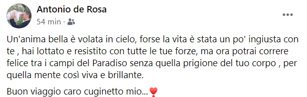 "Un'anima bella è volata in cielo, forse la vita è stata un po' ingiusta con te , hai lottato e resistito con tutte le tue forze, ma ora potrai correre- si legge nella nota- felice tra i campi del Paradiso senza quella prigione del tuo corpo , per quella mente così viva e brillante. Buon viaggio caro cuginetto mio..."