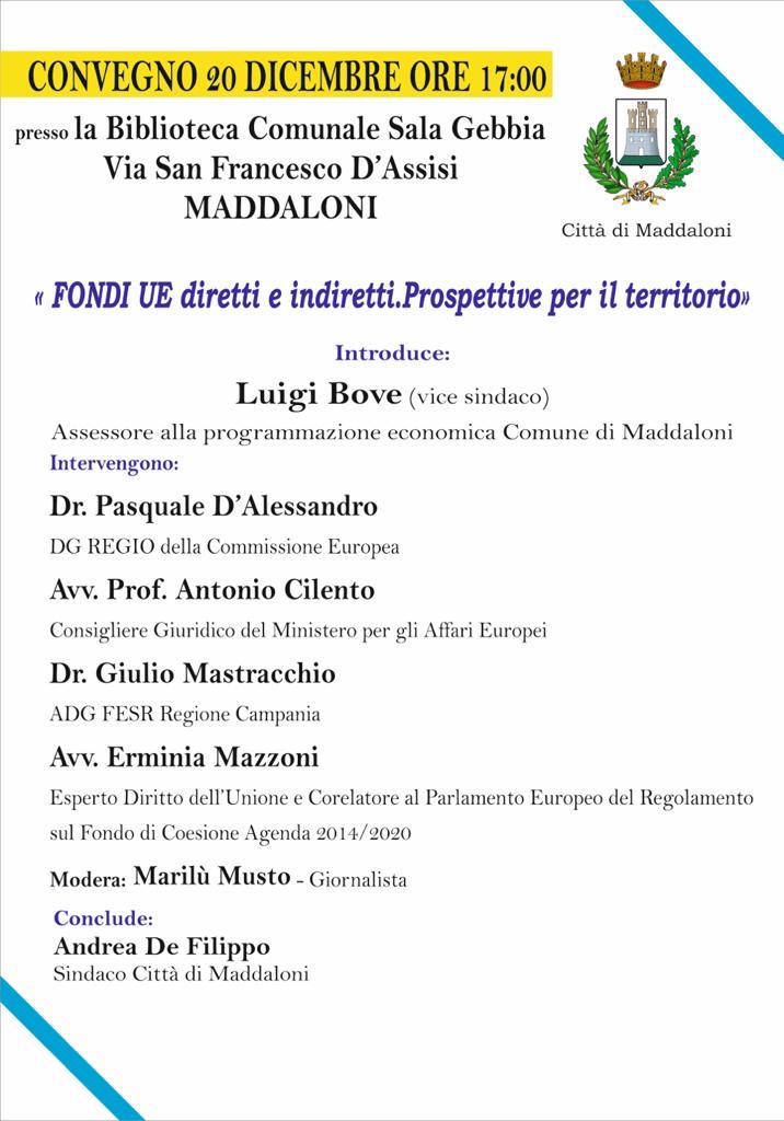 Venerdì 20 dicembre alle ore 17, presso la Sala Gebbia della Biblioteca Comunale sita a Maddaloni, si terrà il convegno "Fondi UE diretti e indiretti. Prospettive per il territorio". All'incontro saranno presenti il Sindaco Andrea De Filippo ed il vicesindaco Luigi Bove, oltre ad altri importanti interventi.