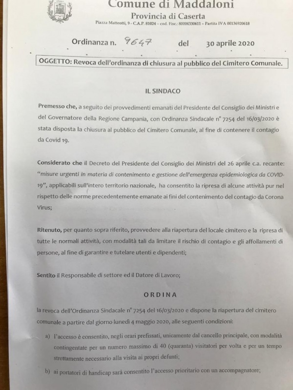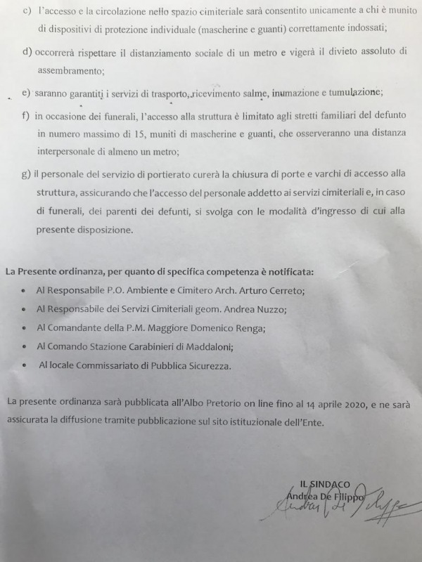 Questa l'ordinanza del Sindaco De Filippo: